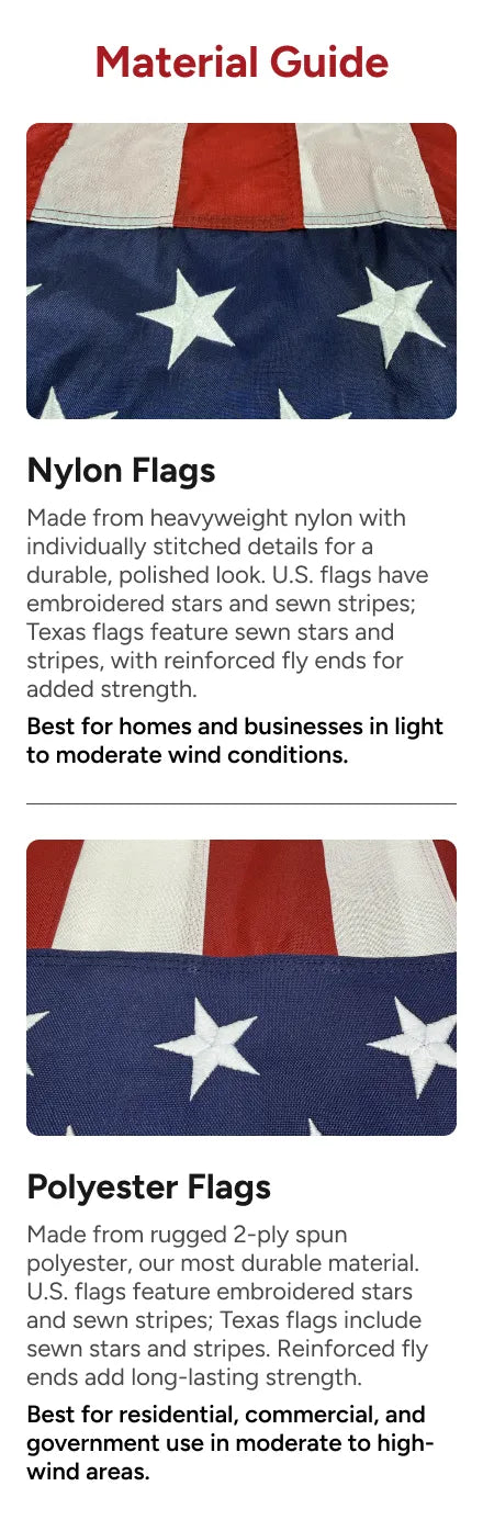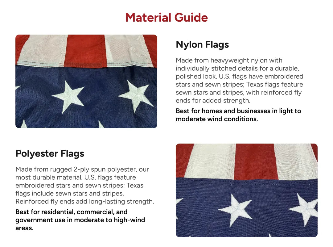 Choose the right material to match your environment and ensure your flag stands tall, season after season.